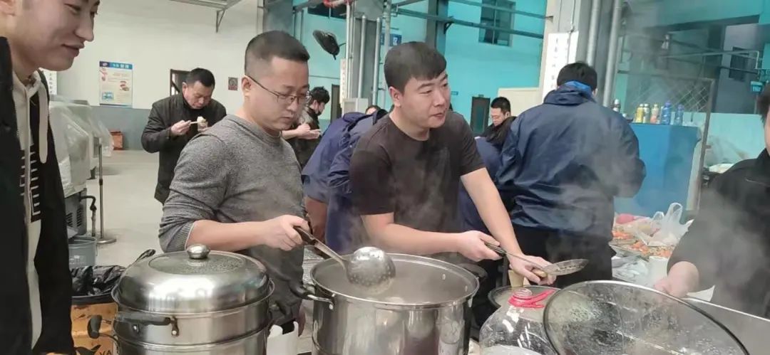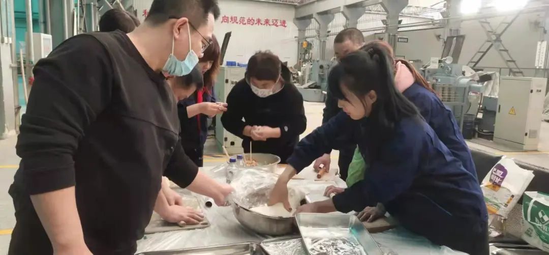 和面、拌馅、包饺子、煮饺子把活动推向了高潮,大家撸胳膊挽袖子,各显神通,一个个象征着团圆的饺子铺满了桌面,在幸福欢快的背景乐下,整个场面再次热气腾腾。