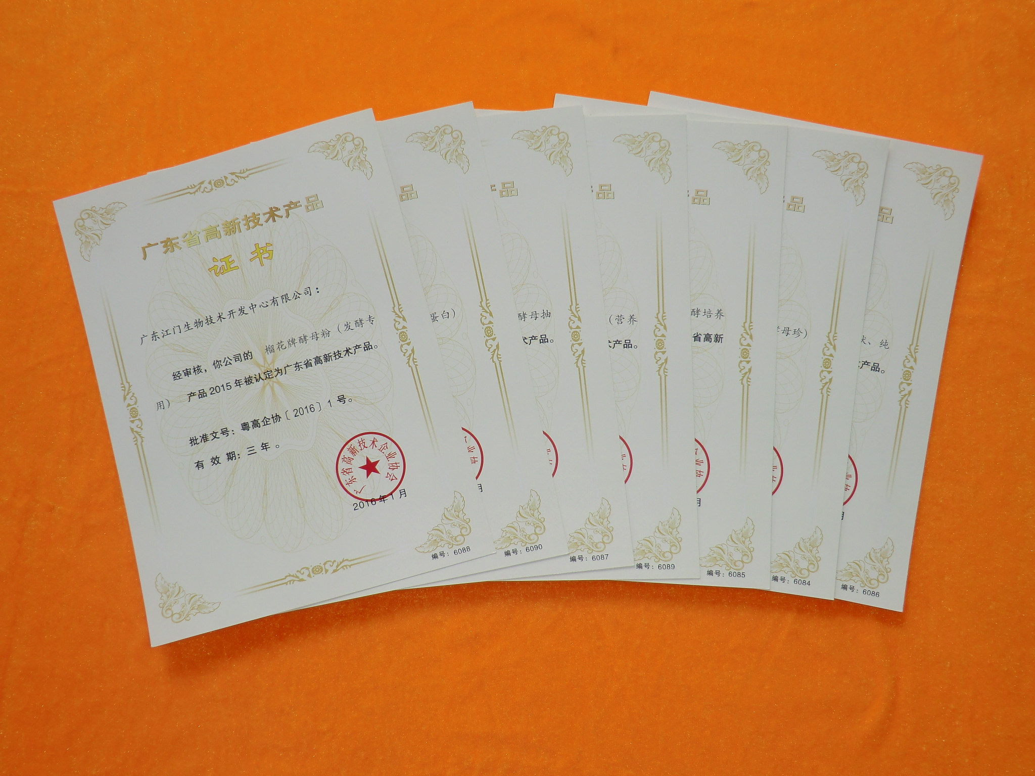 2016年1月份,生物中心的食用酵母、榴花牌酵母粉、酵母抽提物、酵母精粉、破壁型食用酵母、风味复合酵母、甘蔗糖蜜酵母发酵培养物共7项产品通过省科技厅严格审核,获认定为2015年“广东省高新技术产品”并取得证书。