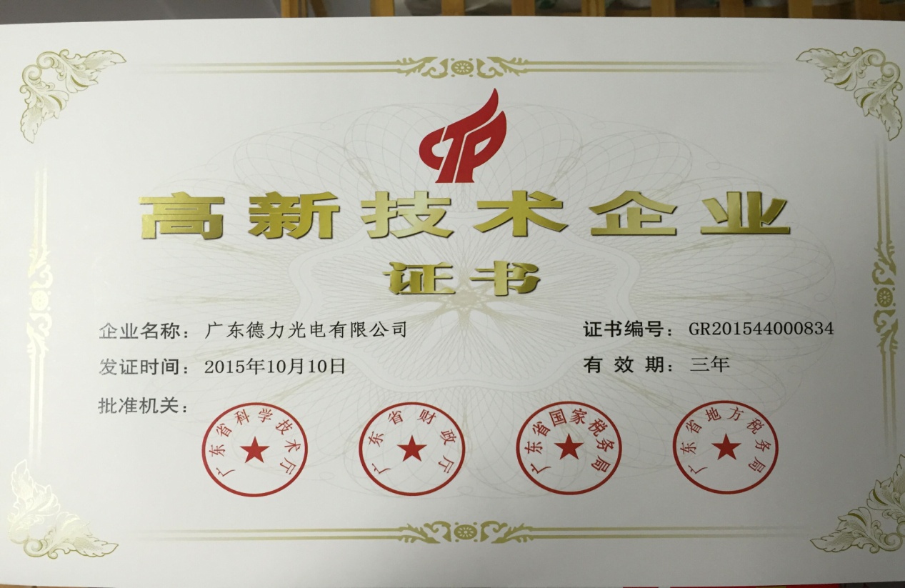2016年3月25日德力光电收到广东省科学技术厅、广东省财政厅、广东省国家税务局、广东省地方税务局联合颁发的《高新技术企业证书》。这是对德力光电科研成果及技术创新的认可,是企业科技实力及持续创新能力的证明。